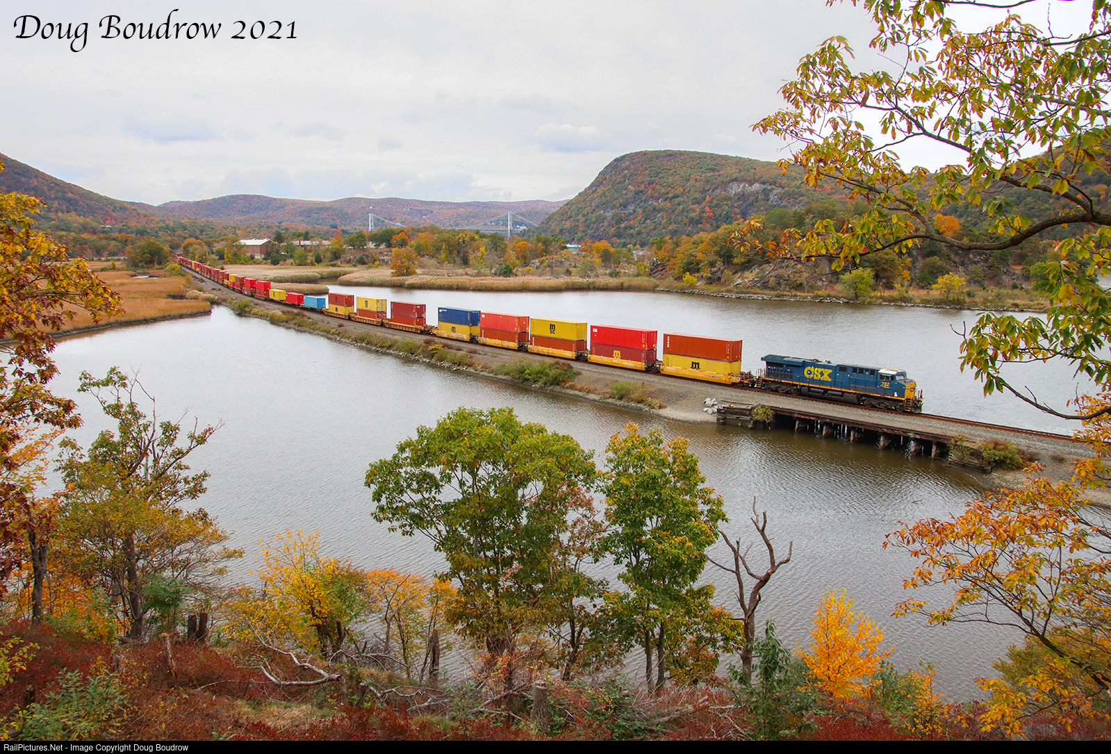| CSX train Q212 is seen on the causeway at Iona Island in Stony Point, New York. Iona Island is home to a bird sanctuary, but the brick facility in the background served as a naval ammunition depot from 1899 to 1947. The busy CSX River Line transects the island and sees multiple freight trains daily. The Bear Mountain Bridge can be seen in the background. |