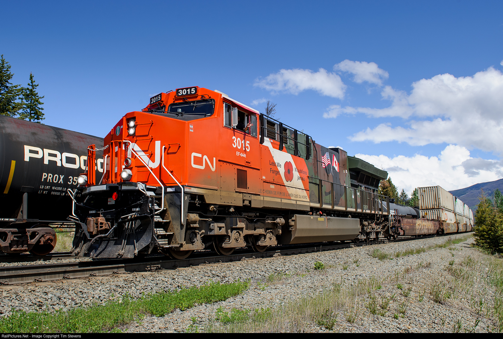 Painted to honour our Veterans, CN ET44AC 3015 has just departed Jasper Yard with Q105's train in tow.