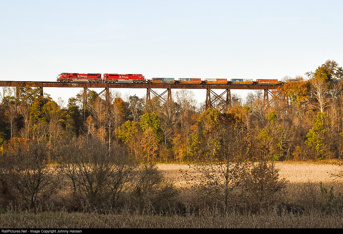 | It’s a beautiful Sunday evening in Southern Indiana as Indiana Rail Roads train SAHW (Senate Ave Yard - Hiawatha Yard) makes it’s way towards Hiawatha Yard in Jasonville with the usual duo of Indiana Rail Road SD9043MACs. The train is seen here beginning its trek over the 116 year old Tulip Viaduct. The trestle was built in 1905 by the Indianapolis Southern Railway, which became part of the Illinois Central Railroad in 1911. It is 2,295 feet in length and is the biggest railroad bridge in all of Indiana. The Tulip Trestle is the biggest trestle along the old Illinois Central “Hi-Dry Line” as well. The Indianapolis District of the former Illinois Central was known as the “Hi-Dry Line” for many high fills and bridges/trestles, which makes the line very photogenic. |