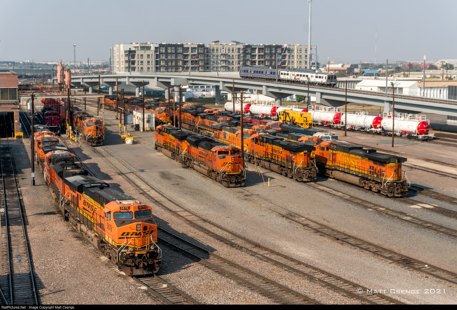 A sea of orange locomotives are seen sitting at BNSF Railway's Denver Diesel Shop, while an RTD N Line train passes on the flyover east of the yard. The flyover appears to only cross one track, which is part of a wye connecting the BNSF tracks to the UP tracks that the RTD A Line parallels. Of course, all of these lines then meet at Union Station just west of here anyways...