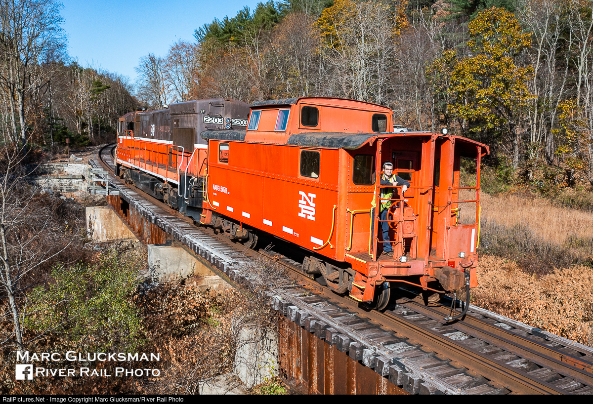 Not For Tourists. On Monday, November 8, 2021, Naugatuck Railroad Freight/Railroad Museum of New England N-5 Caboose 507 is shoved by U23B NAUG 2203 (ex-PW 2203, née-CR 2798, 6/1977) through Thomaston, Connecticut, over Jericho Bridge and the Naugatuck River. The crew is on the way to pick up loaded cars at the Frost Bridge Transfer Facility in Watertown, Connecticut to interchange with Pan Am Railways. While the railroad is more popularly known for its passenger tourist trains, freight has been a regular part of the operation for several years.