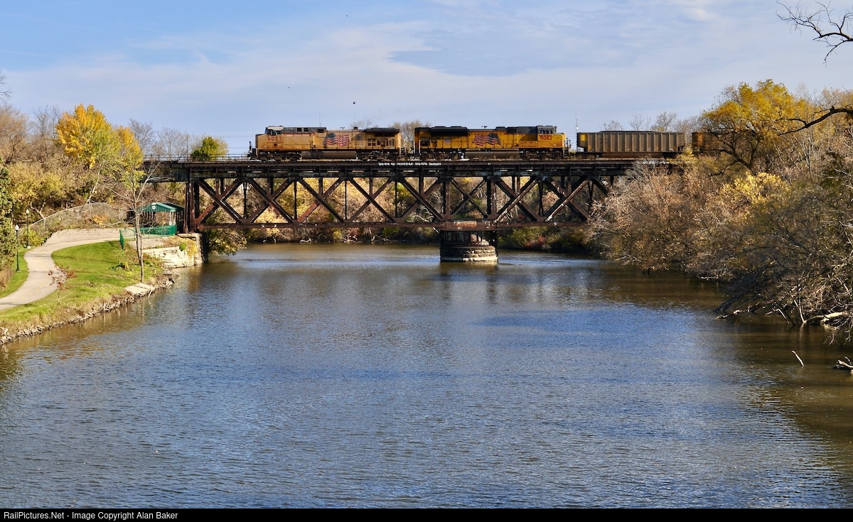 A loaded Oak Creek coal train crosses the Root River on a beautiful fall day.