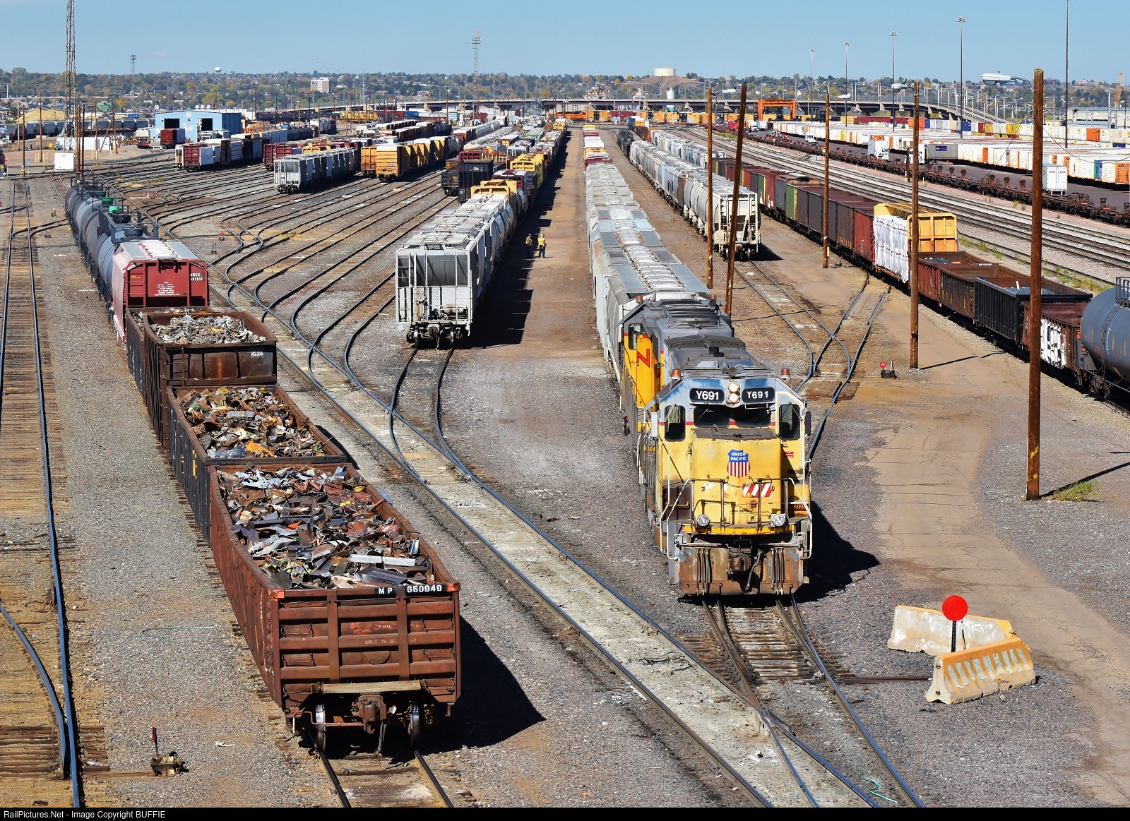 UPY 691 (GP15-1) works a cut of cars in the large North Yard in Denver, Colorado.