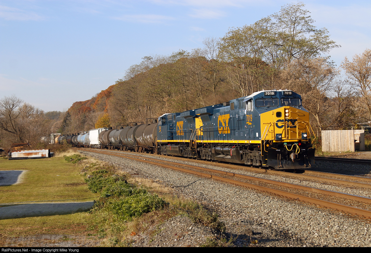 | Fresh from GE, CSXT 7019 and 7016 lead Q368 east through town, these arent even a few weeks old as they shine bright supporting the older YN3 paint. |