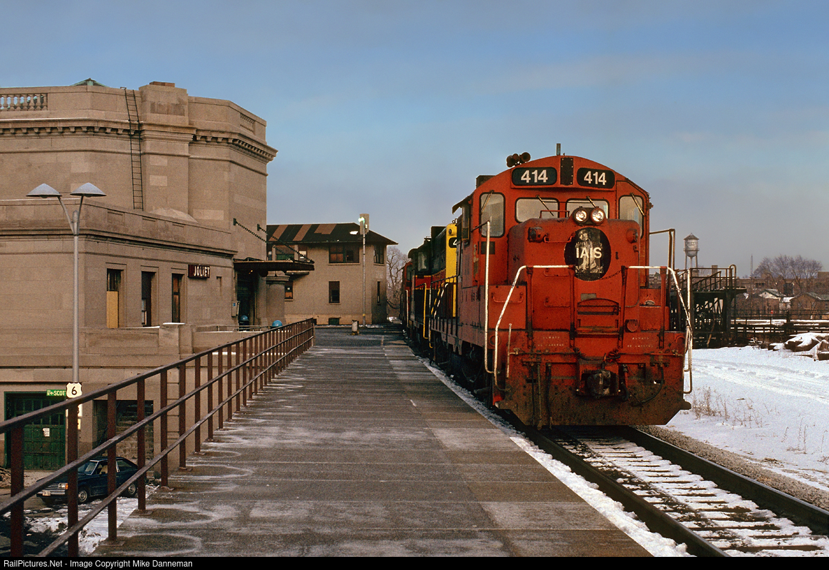 A westbound Iowa Interstate Railroad freight clatters over the Santa Fe main line at Joliet Union Station on the afternoon of February 22, 1989. Iowa Interstate was formed on November 2, 1984, to operate the former Rock Island main line between Chicago and Council Bluffs, Iowa.
