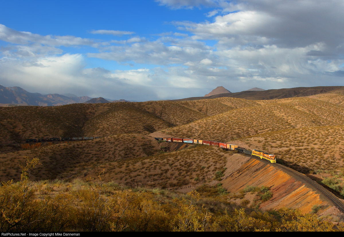 On October 26, 2020, after a rainy and cold day in the high desert country of Arizona, the sun breaks out briefly late in the afternoon, illuminating the scene in golden light, as the Arizona Eastern Railway’s South Siding to Clifton train works upgrade toward Tunnel 6 south of Clifton. The job is doubling the hill because of heavy tonnage and wet rails, and is making its third trip up to the top of the grade at South Siding, including a morning run to Clifton to pick up cars left by Freeport McMoRan’s industrial railroad over the weekend.