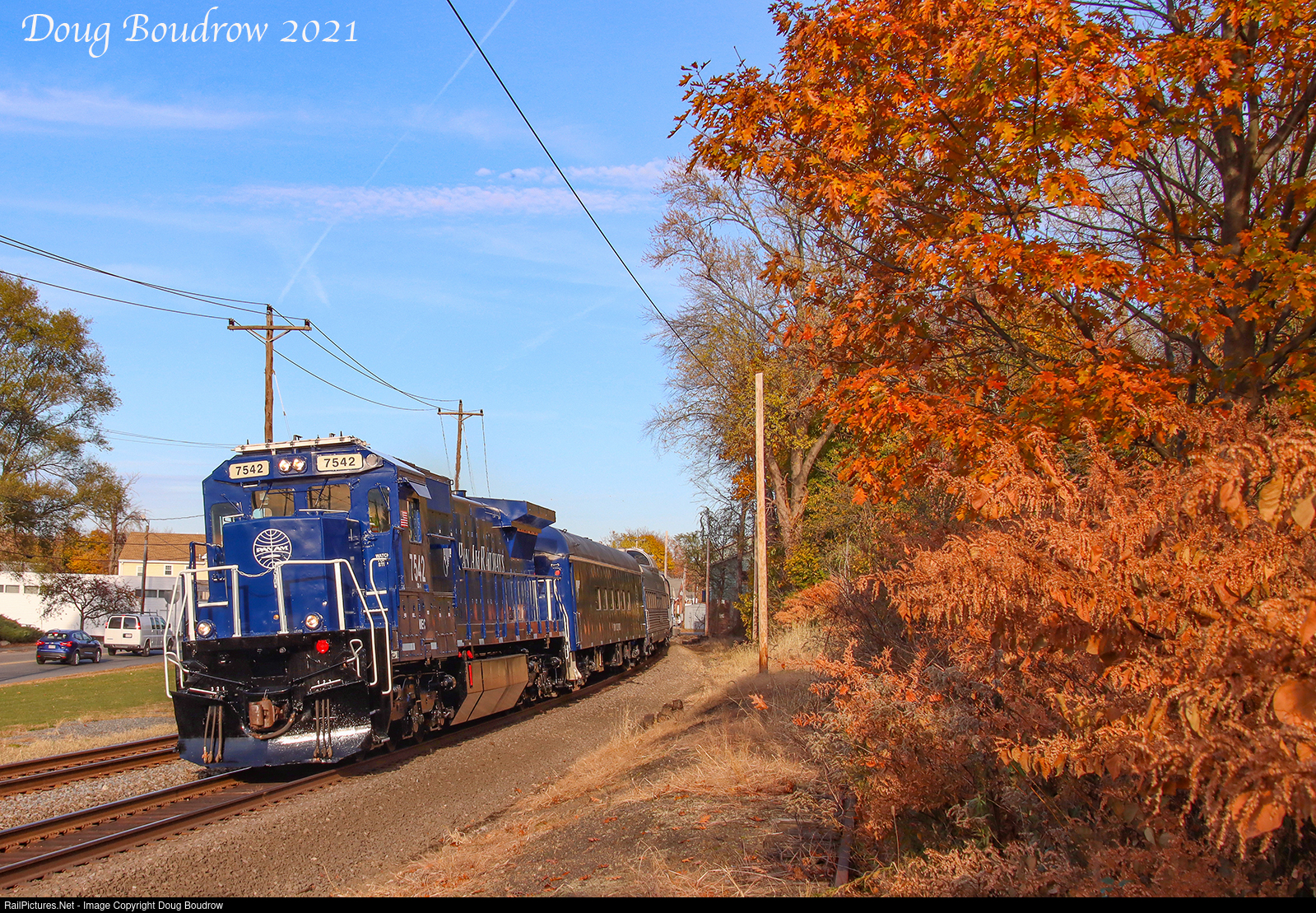 | The Pan Am OCS is seen at Sutton Street in North Andover. The train is being led by locomotive 7542 (built as CSX 7542, August, 1989). The unit appears to have been freshly painted in its second coat of Pan Am blue paint. Due to the installation of positive train control on this territory, the classic FP9 set can no longer lead here forcing the OCS to have different power. |