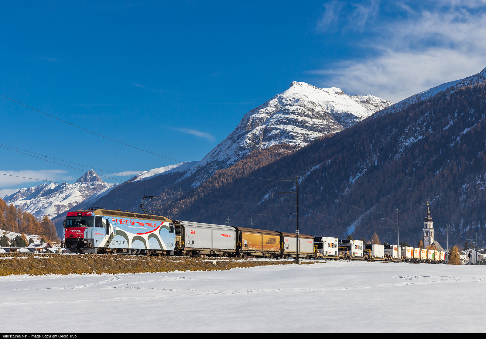 Since the beginning of November, the Rhaetian Railway has officially decommissioned the locomotives of the series Ge 6/6 II 701 to 707 (# 702, 705 and 707 were still active at the end) and the Ge 4/4 I of the series 601 to 610 (# 603, 605 and 610 still active), i.e. they are no longer in regular service. In front of the freight trains you can see now the Ge 4/4 III and Ge 4/4 II (these partly in double traction). Ge 4/4 III # 650 of the Rhaetian Railway, in the publicity paint scheme for the UNESCO World Heritage Albula Bernina, is pulling the freight train 5140 from Samedan over the Albula line to Landquart freight yard, leaving Bever towards Spinas.
