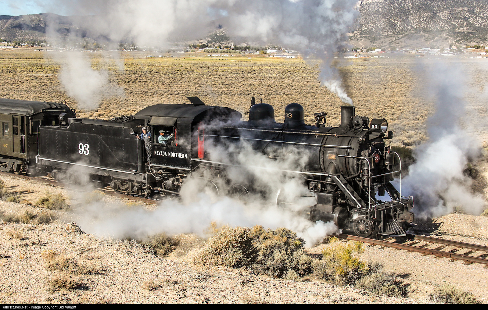 Not the star of the show but looking good in the chill desert air No. 93 is pulling our railfan chase train to a location for photos of the new kid on the block, number 81. This Nevada Northern Ry at Ely, NV on 10/09/2021, Day 2 of “Trains” magazine 81st anniversary.