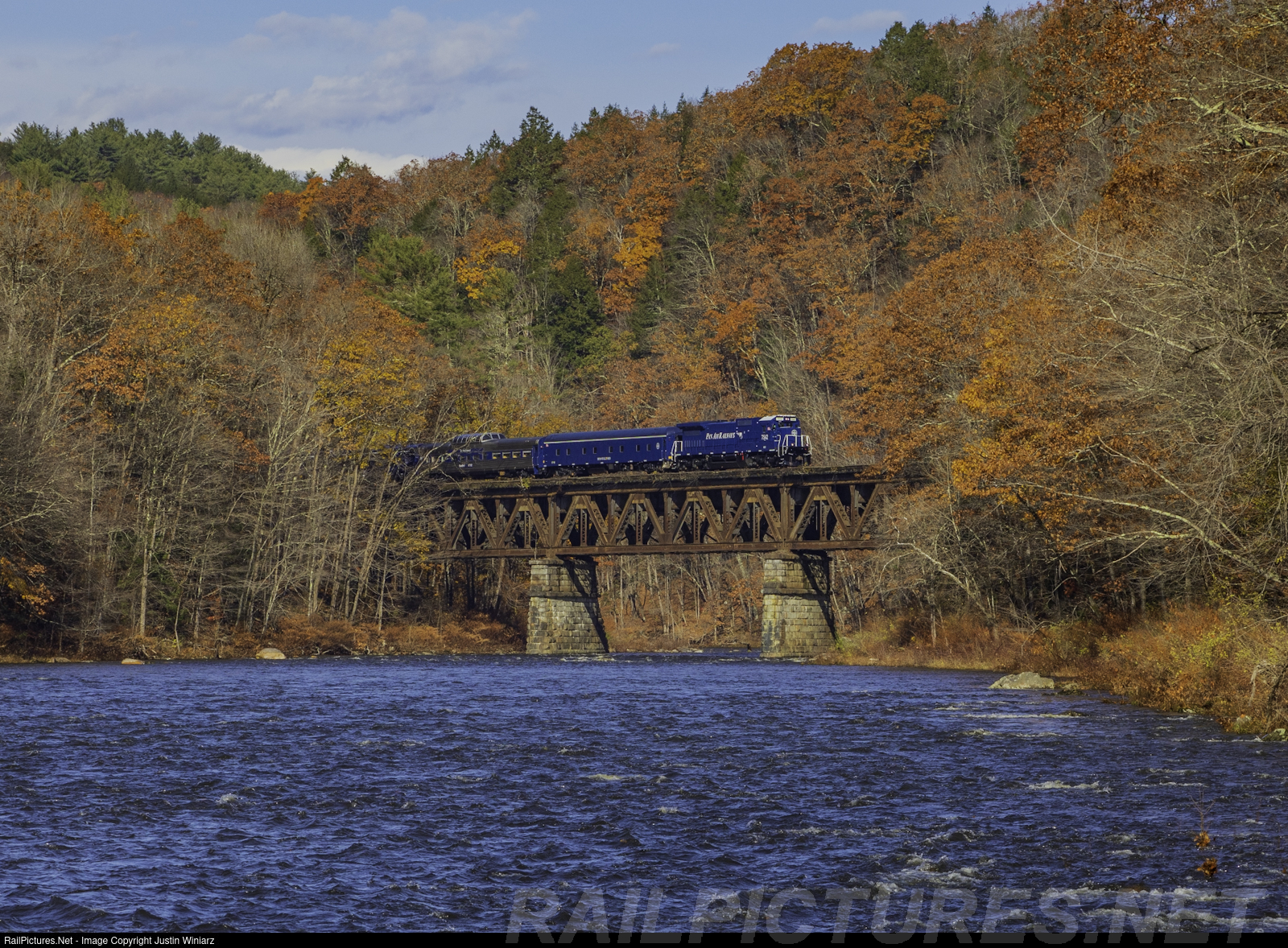 Due to the normal pair of FP9 units not having PTC. C40 7542 was called upon and repainted to lead the OCS. After a trip to Mechanicville, NY the train made a deadhead move back east. Seen here crossing the Deerfield River. |