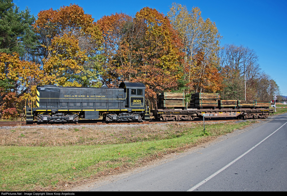Still going strong after 78 years the beautifully restored Raven Rail Alco S-2 D&H 3021 heads out with a 6 axle flatcar loaded with new ties for the Battenkill.
