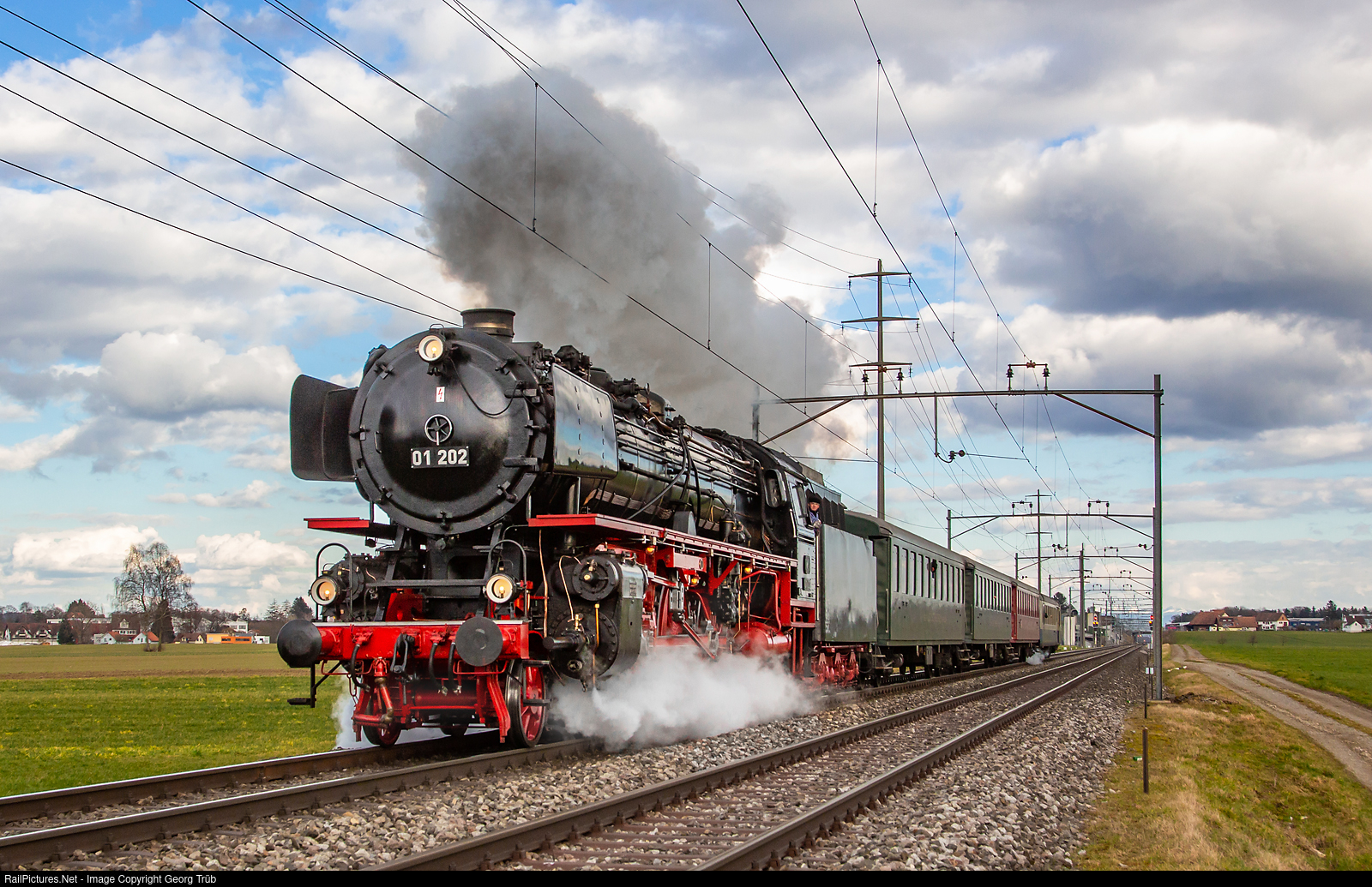 | Former Deutsche Bundesbahn 4-6-2 express train steamlocomotive 01 # 202 of association "Pacific 01 202" in Lyss, is accelerating her train to track speed after the crossover of Oberaach. The train "Bratwurst Express" is on the way back from St.Gallen via Romanshorn-Winterthur-Regensdorf-Baden Oberstadt-Lenzburg-Olten-Biel shunting yard to Lyss. |