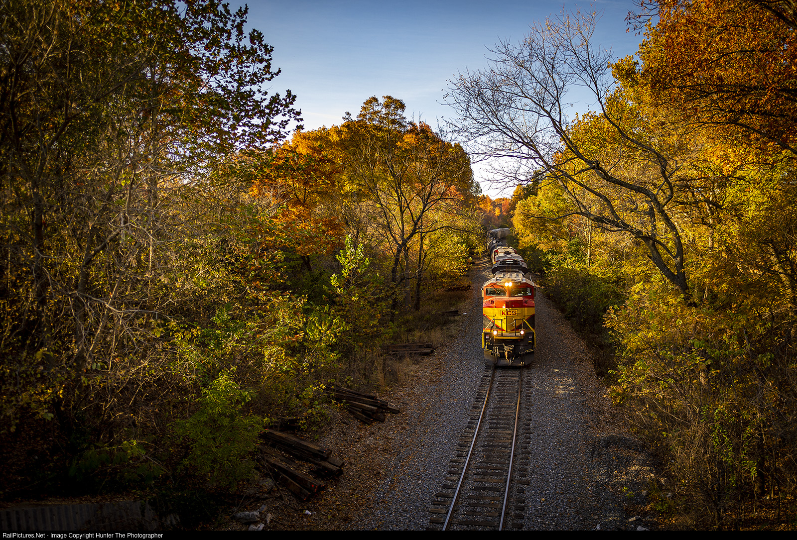 | Surrounded by brilliant fall colors, southbound Kansas City Southern manifest train MKCSH rolls through Gravette, AR on a sunny November 14, 2021. |