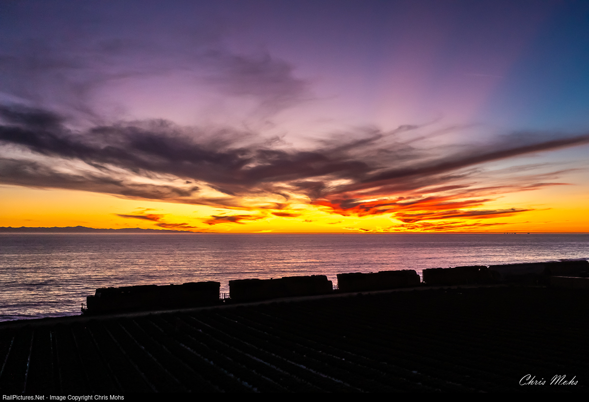 A fiery sunset over Santa Cruz Island and the Santa Barbara Subdivision with the southbound Guadalupe Local silhouetted at Seacliff Siding.