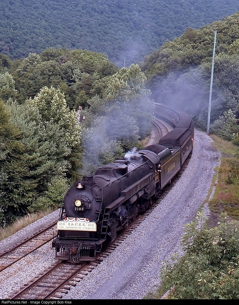 Reading T-1 No. 2102 leads a special train commemorating the 150th anniversary of the opening of the Little Schuylkill Navigation, Railroad and Coal Company (LSRR) past Pulpit Rock, where preachers preached to the canal boat men back in the day. There are two divers on the rock above the stack, ready to take the plunge. During the original Reading Rambles, 1959-64, the Schuylkill River was visible from this vantage point, but the foliage probably hasn't been trimmed since that time.