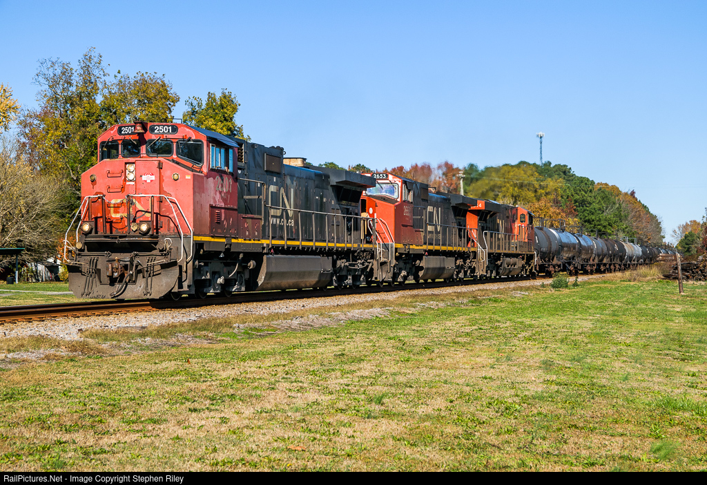 A trio of Canadian National locomotives from north of the border bring a loaded molten sulfur train through the community of Whitakers, NC destined for the phosphate mine in Aroura, NC. |