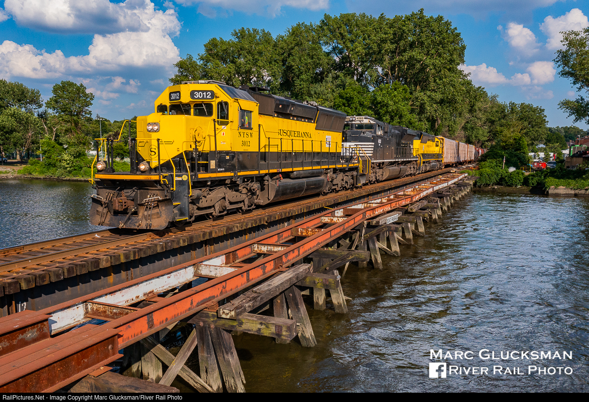 Tunnel Motor On The Bridge. New York, Susquehanna, and Western Railway SU-99 was lead by NYSW 3012 (SD33ECO) over the Hackensack River into Hackensack, new Jersey on June 30, 2020. Before receiving an extensive rebuild, this unit was built as Southern Pacific 8242 (SD40T-2, 4/1980). The train is a few minutes into its journey from Ridgefield Park, New Jersey to Binghamton, New York, where it will receive a recrew and continue to Syracuse, New York.