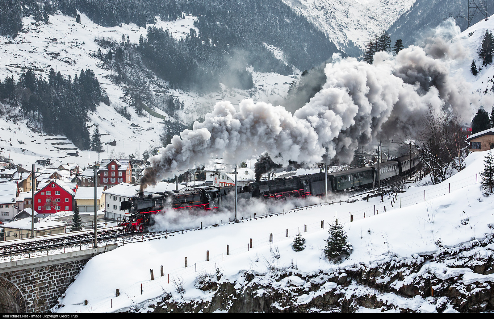 | Double traction steamtrain with the two former Deutsche Bahn "Pacific" coal fired two cylinder 01 202 (Association Pacific 01 202 in Lyss, Switzerland) and haevy fuel oil fired, three cylinder 01 1066 (lettered as 012 066) of the Ulmer Eisenbahnfreunde (UEF). The train started in Munich/Germany the day before, reached Switzerland in the morning in Schaffhausen and is going to Locarno. Now it is tackling the 2.6 % grade of the northern ramp to the Gotthard tunnel at Wassen. |