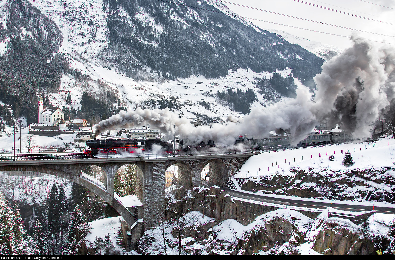 Double traction steamtrain with the two former Deutsche Bahn "Pacific" coal fired two cylinder 01 # 202 (Association Pacific 01 202 in Lyss, Switzerland) and haevy fuel oil fired, three cylinder 01 # 1066 (lettered as 012 # 066) of the Ulmer Eisenbahnfreunde (UEF). The train started in Munich/Germany the day before, reached Switzerland in the morning in Schaffhausen and is going to Locarno. Now it is tackling the 2.6 % grade of the northern ramp to the Gotthard tunnel at Wassen, crossing the middle Meienreuss bridge and passing the famous church of Wassen.