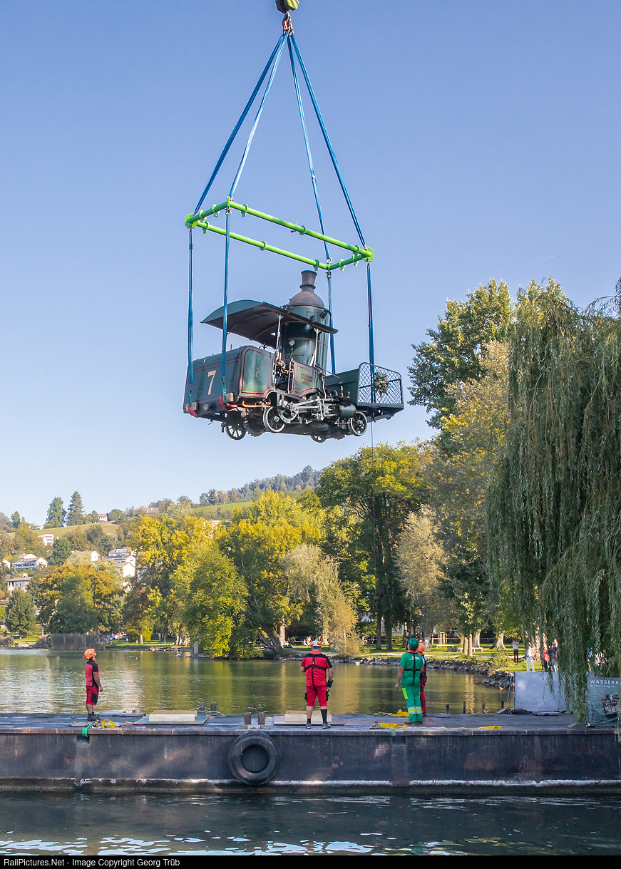 The project to bring the only operable steam rack-and-pinion locomotive with an upright boiler, the H 1/2 # 7 built in 1873, out of the Swiss Museum of Transport (VHS) and to use it on the Rigi in the anniversary year was awarded the Milestone Tourism Prize in the Innovation category (2nd place). The award ceremony took place on November 16, 2021 in the Casino Hall in Bern. On September 15, 2020, the locomotive was transported from Lucerne across Lake Lucerne and unloaded in Vitznau. A large crane is lifting the locomotive in Lucerne to load on a large barque.