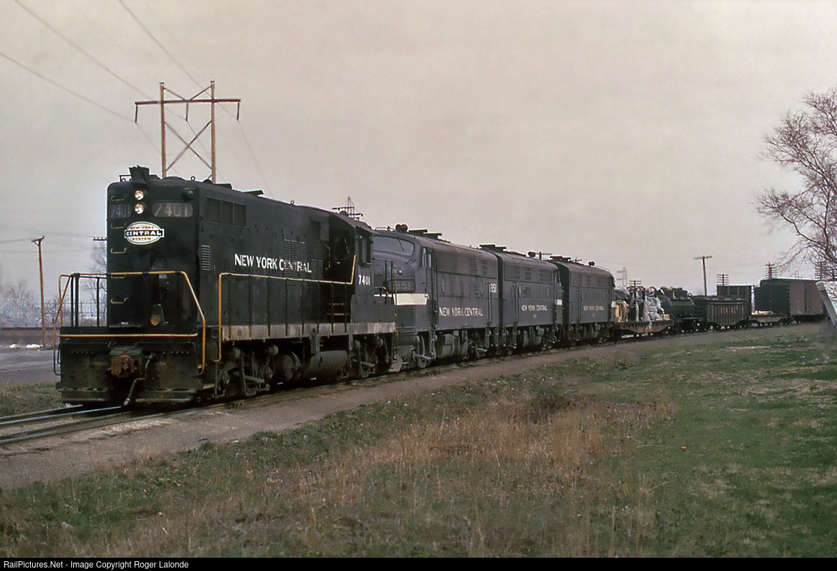 In March 1965, NYC GP9 7401 arrived at Mitchell, Ill., near East. St. Louis yard with a freight from Indianapolis. One Geep and three F-7's provided the power. The three F-7's 1851-1644-1791 all wore the "cigar band on black" color scheme. Part of my slide collection, Frank Smith Photo.