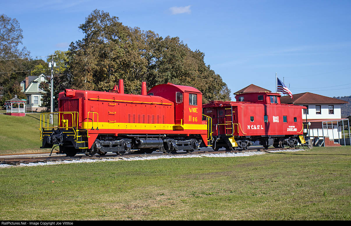 A Walking Horse and Eastern SW9 along with a NC&StL caboose sits displayed outside the Bridgeport Alabama depot.
