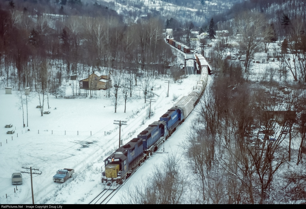 A Northbound Delaware & Hudson train, led by three GP38-2’s, one D&H and two Boston & Maine, snake through the curves of the Penn Division at Lanesboro, Pennsylvania. The gloomy December day is coming to an end as the train begins its journey to Oneota.
