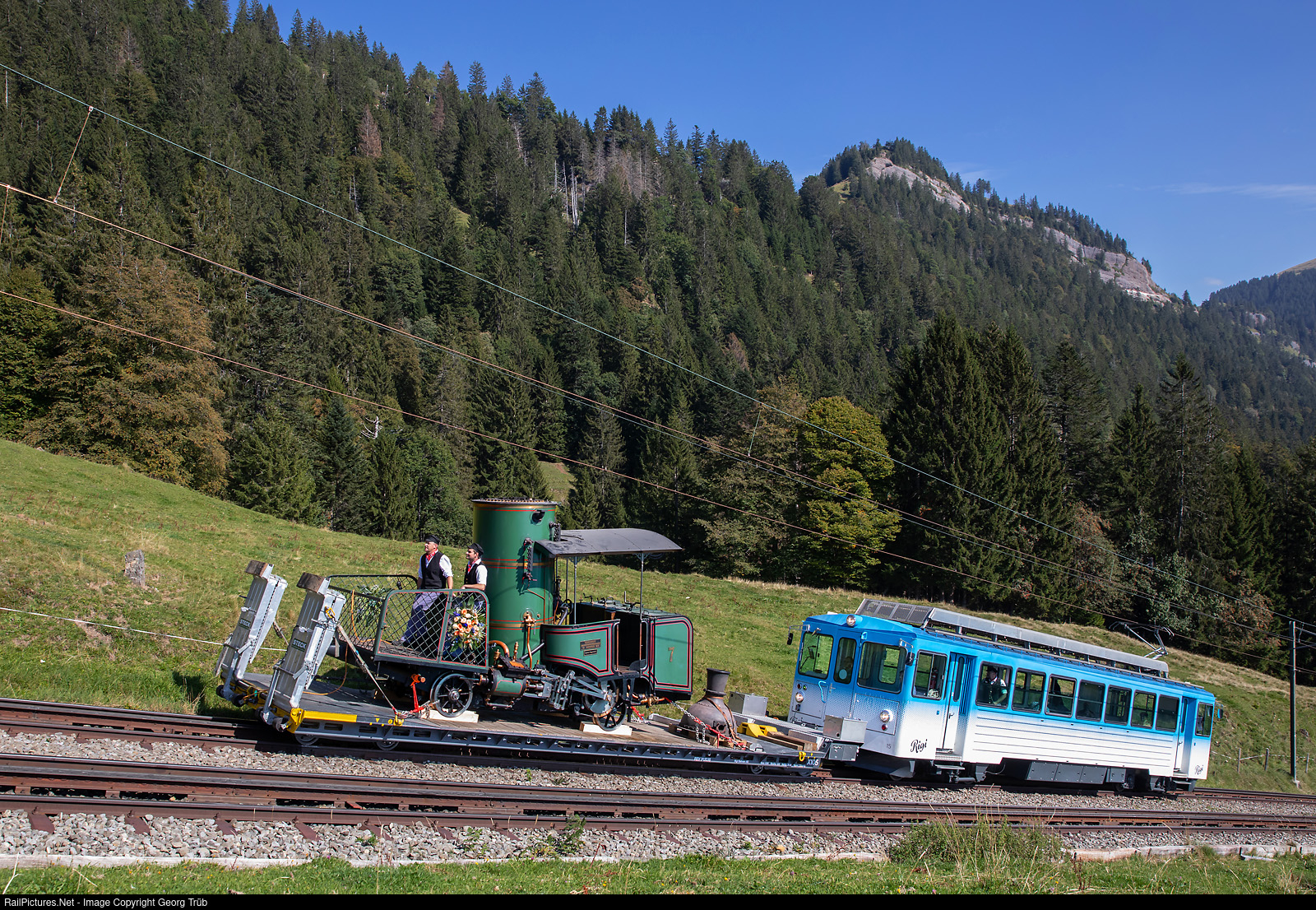 Cogwheel railcar BDhe 4/4 # 15 of the Rigi Bahnen, built in 1982, is shoving the low loader car X # 105 with the steamlocomotive H 1/2 # 7 of 1873, between Romiti Felsentor and Rigi Kaltbad-First. This iconic number 7 was brought this day out of the Swiss Museum of Transport in Lucerne and shipped over the Lake Lucerne on a barque to Vitznau. Now the locomotive is going over the Rigi mountain to the Arth Goldau workshop for revision and commissioning. For the 150 anniversary of the Rigi Bahnen the locomotive was running up to the mountain numerous time in 2021 and will do so in 2022 and 2023.