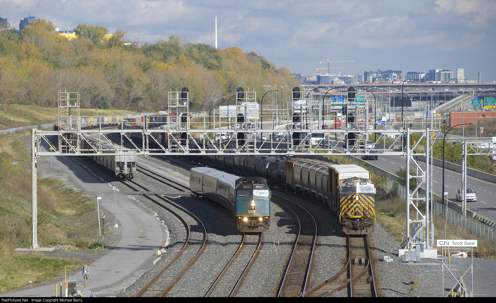 VIA 67 will soon cross over from the Freight Track to the North Track as it passes CN 305 at Turcot Ouest.