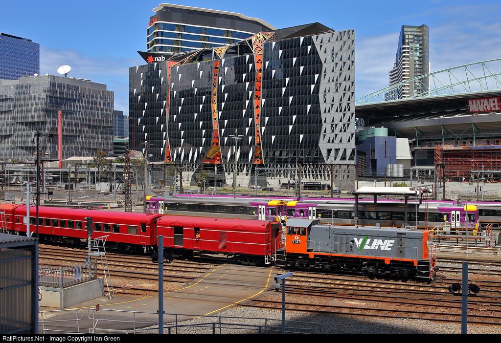 Y127 freshly repainted in V/Line livery works a 707 Operations special to Bacchus Marsh near Southern Cross Station.