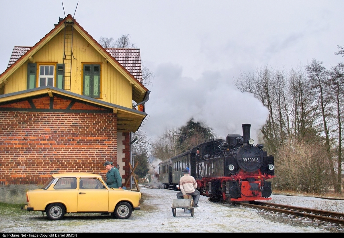 | DR flashback. Nothing is lacking in this recreation of the GDR atmosphere at the Strassberg station. A Trabant is parked at the station, two police officers from the VoPo (Volkspolizei) are controling the driver. The GDR flag also flies on the pediment of the station. A Bernd Seiler charter. |