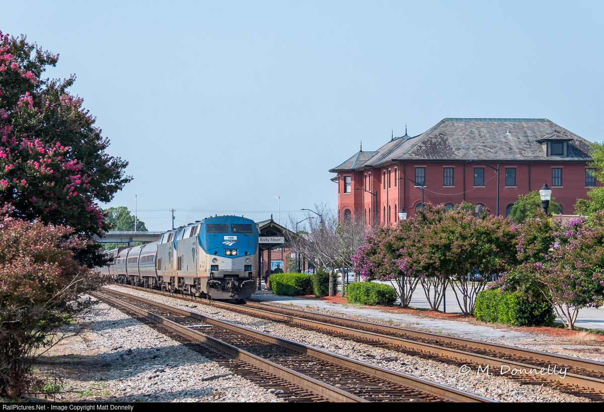 | The northbound Silver Meteor makes its station stop at Rocky Mount, running with an abbreviated consist due to low travel demand during COVID19. |