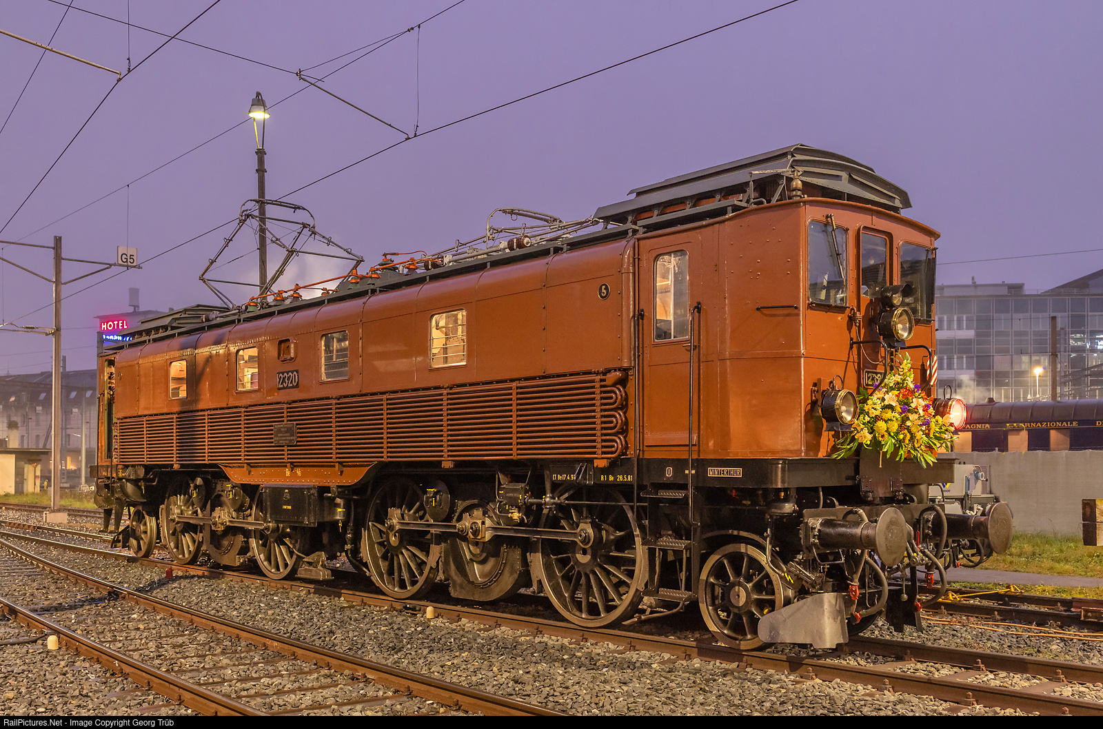 Electrolocomotive Be 4/6 # 12320 of SBB Historic, called "Rehbock" (Roebuck) and based in Winterthur, celebrated 100 years of operation (1921 to 2021) and was decorated with flowers for the jubilee round trip. The locomotive, built by SLM and BBC for passenger trains on the Gotthard line of the SBB, is standing in front of the shed early in the morning. The Be 4/6 # 12320 was never discarded and has been at the Winterthur depot as a historic locomotive in the brown paint scheme since 1975 already.
