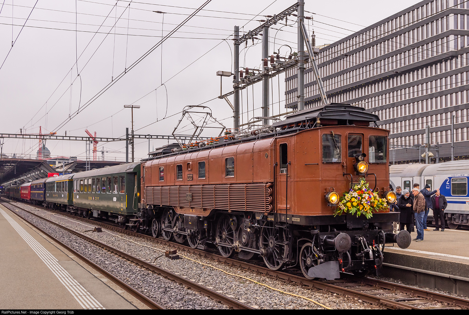 | Electrolocomotive Be 4/6 # 12320 of SBB Historic, called "Rehbock" (Roebuck) and based in Winterthur, celebrated 100 years of operation (1921 to 2021) and was decorated with flowers for the jubilee round trip. The locomotive, built by SLM and BBC for passenger trains on the Gotthard line of the SBB, is ready for departure with the jubilee round trip in Zürich main station. The journey was via Zürich Oerlikon-Regensdorf-Wettingen-Mellingen-Lenzburg-Suhr-Zofingen-Olten-Brugg-Turgi-Koblenz-Eglisau-Bülach-Winterthur and back via Wallisellen to Zürich. |