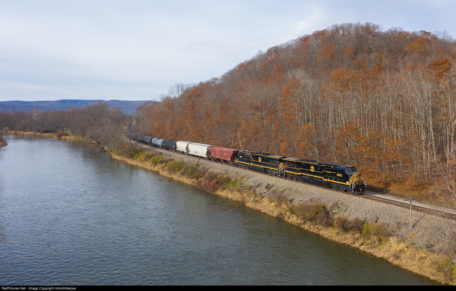 A pair of Western New York and Pennsylvania AC6000's head east alongside the Allegheny River outside of Allegheny, New York. The WNYP's OL-1 crew is heading back towards Olean after picking up interchange cars from the B&P in Salamanca.