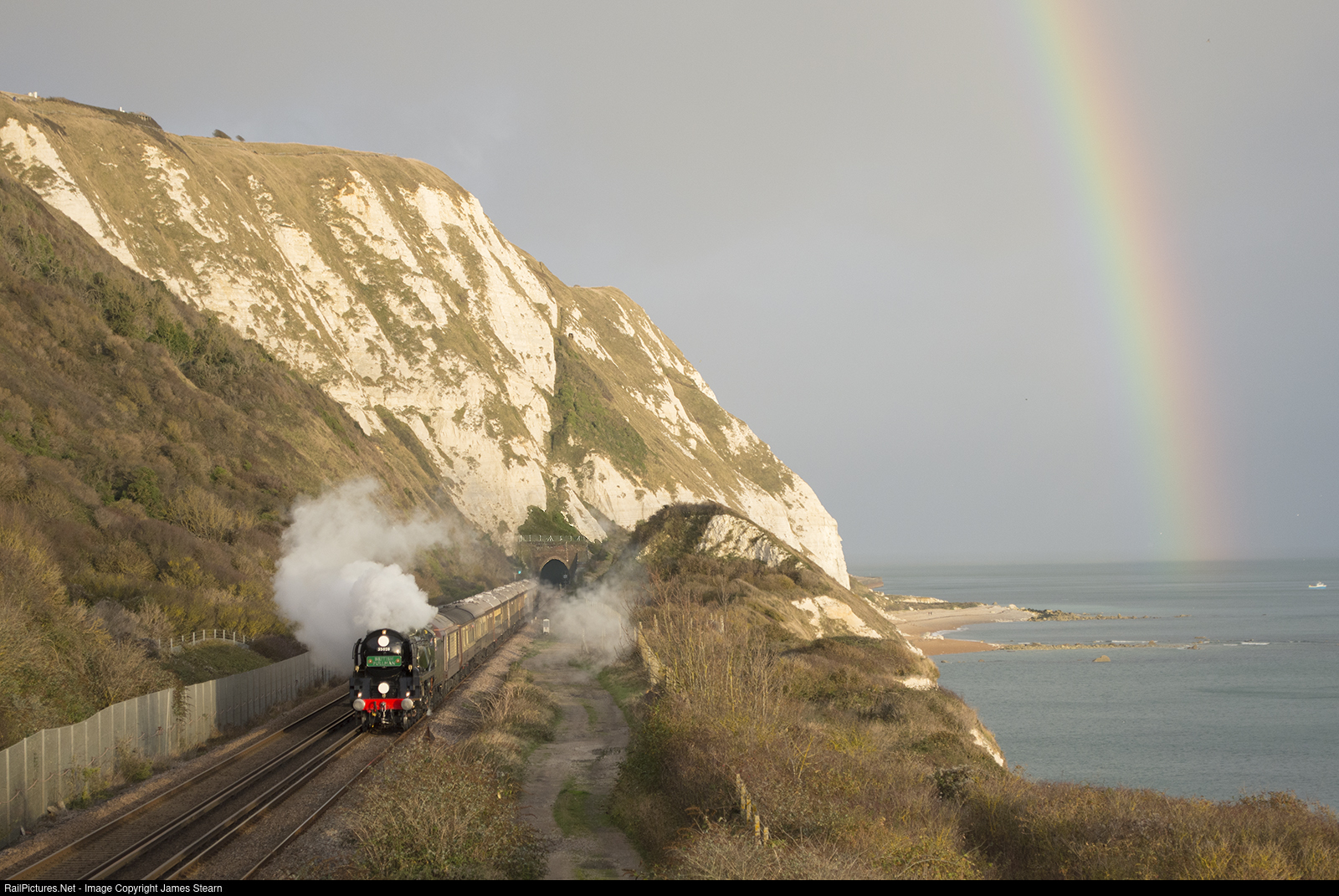 With the first favourable weather forecast in about a week falling on a Sunday there weren't an awful lot of options for something interesting to point my camera at. 35028 'Clan Line' was booked on a special Charity trip (originally booked with Tornado, which was unavailable) around the Kent Coast with the British Pullman set so I thought I would head down to Folkestone to try the shot under the cliffs that had been on my 'bucket list' for some while. Driving down the weather was far from the full sun conditions that had been forecast and I very much thought the entire endeavour would be in vein. Finally in location the clouds had managed to stay away and shortly before the train was due a faint rainbow dropped into the English Channel- wouldn't it be great if that was around for the train... Fortunately the rainbow intensified and 'Clan Line' popped out from the tunnel right on time, just ahead of the encroaching rain which began almost as soon as the tail light had passed. Amazingly it was only myself and a young lad with his Grandma in tow that were there to watch the spectacle.