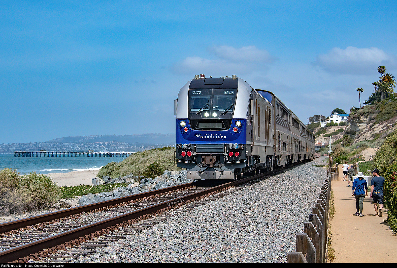 Hugging the coastline as it heads south to San Diego is Amtrak Pacific Surfliner 768, which originated in Goleta, near Santa Barbara. Cruising along the Pacific Ocean at milepost 206, this train in on Metrolink's Orange Sub … for just another 1.4 miles. At that point, it will pass onto San Diego Northern's San Diego Sub. (San Diego Northern is actually the San Diego County's North County Transit District, which operates most of the transit in the county (Coaster and Sprinter commuter trains and also transit buses). This Surfliner has 60 more miles to go before reaching its destination of San Diego, much of it along the beach, as seen here. (San Clemente, California – April 14, 2021)