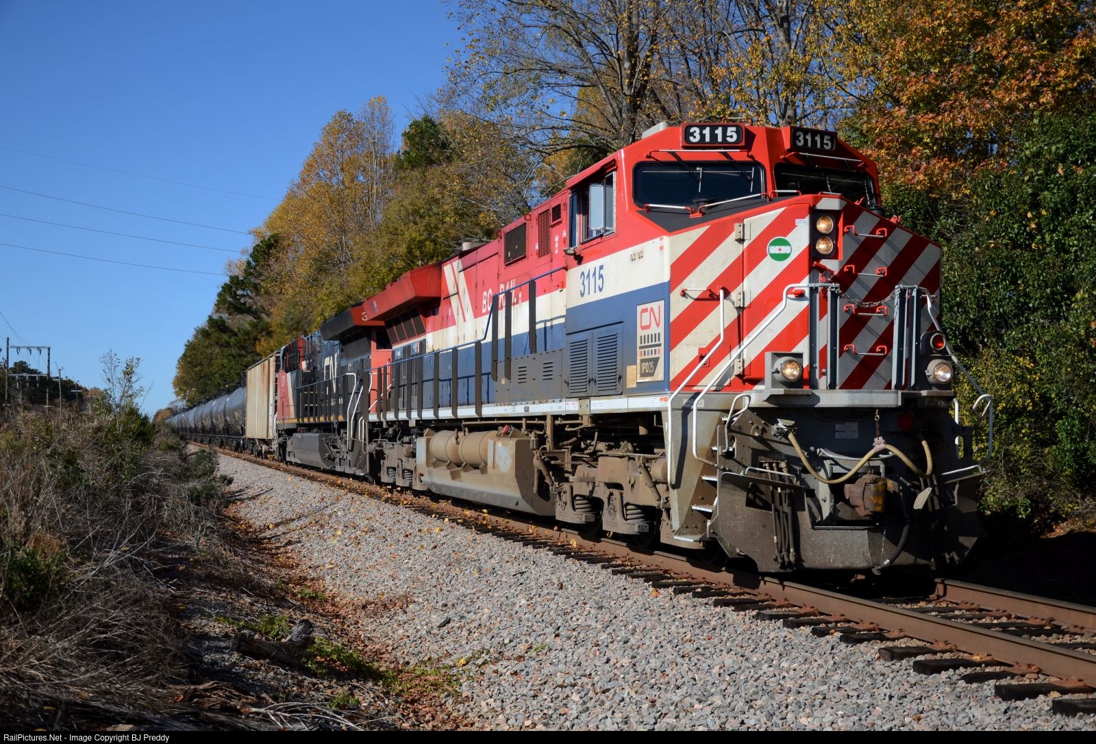 | CSX K706 loaded ethanol train coming into Mt. Holly, on the CSX Charlotte Sub, on a beautiful fall day with the CN BC Rail Heritage GEVO leading another regular CN GEVO and a CSX SD70MAC DPU on the rear. |