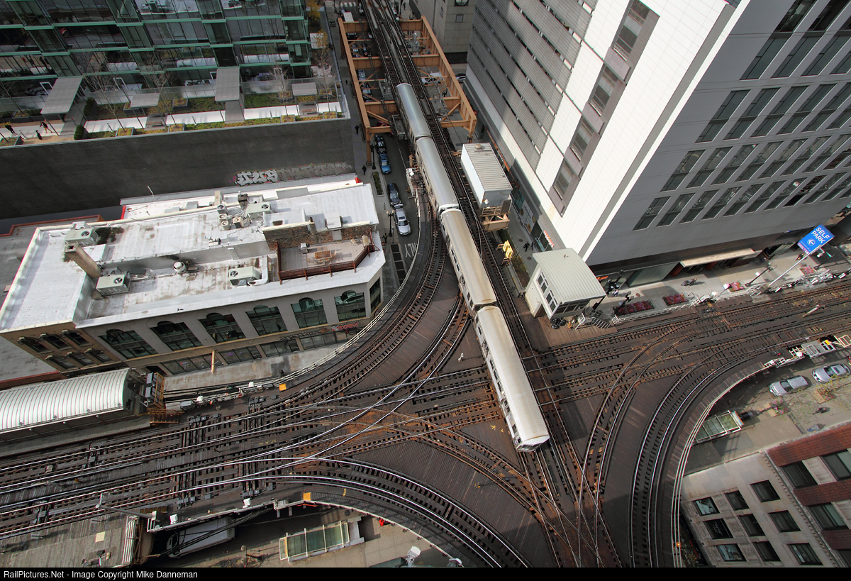 A four-car Chicago Transit Authority commuter train crosses the diamonds at Tower 18 on the elevated āLā rapid transit railway above Lake and Wells Streets on November 8, 2018. This interesting junction is still considered one of the busiest railroad crossings in the world.