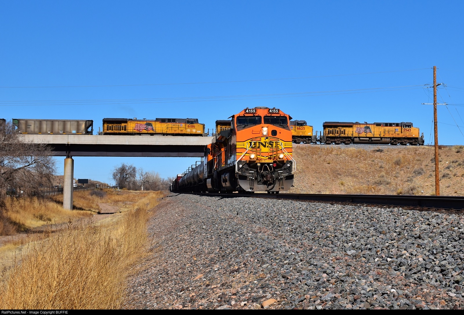 | UP 2543 leads an empty coal train away from the Xcel power plant at Nixon, Colorado just as a BNSF train passed underneath going south on the Joint Line. |