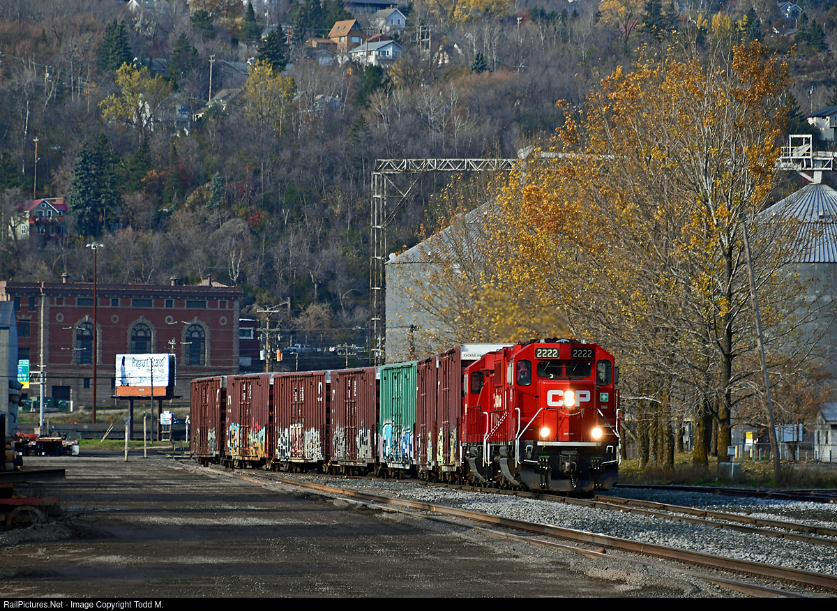 | CP 2222 brings a transfer of boxcars while passing one of the few trees to still be hanging on to its leaves. They are heading to their yard on Rice's Point on the waterfront at Duluth, MN. |
