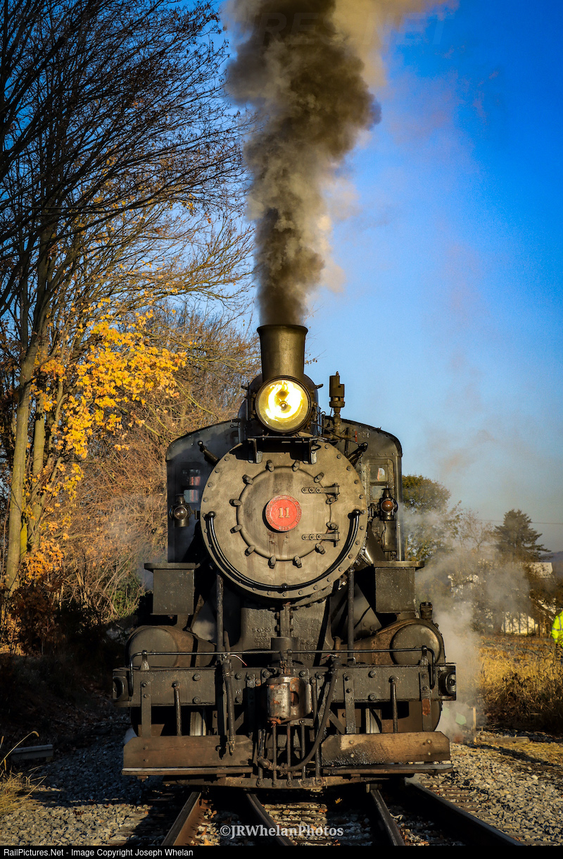 | Everett Railroad 11 idles next to the Pennsylvania Railroad train station at Roaring Spring, ending off John Craft's HTP Photo Charter at the Everett Railroad. Shortly after, she would head north to the shops at Claysburg. |
