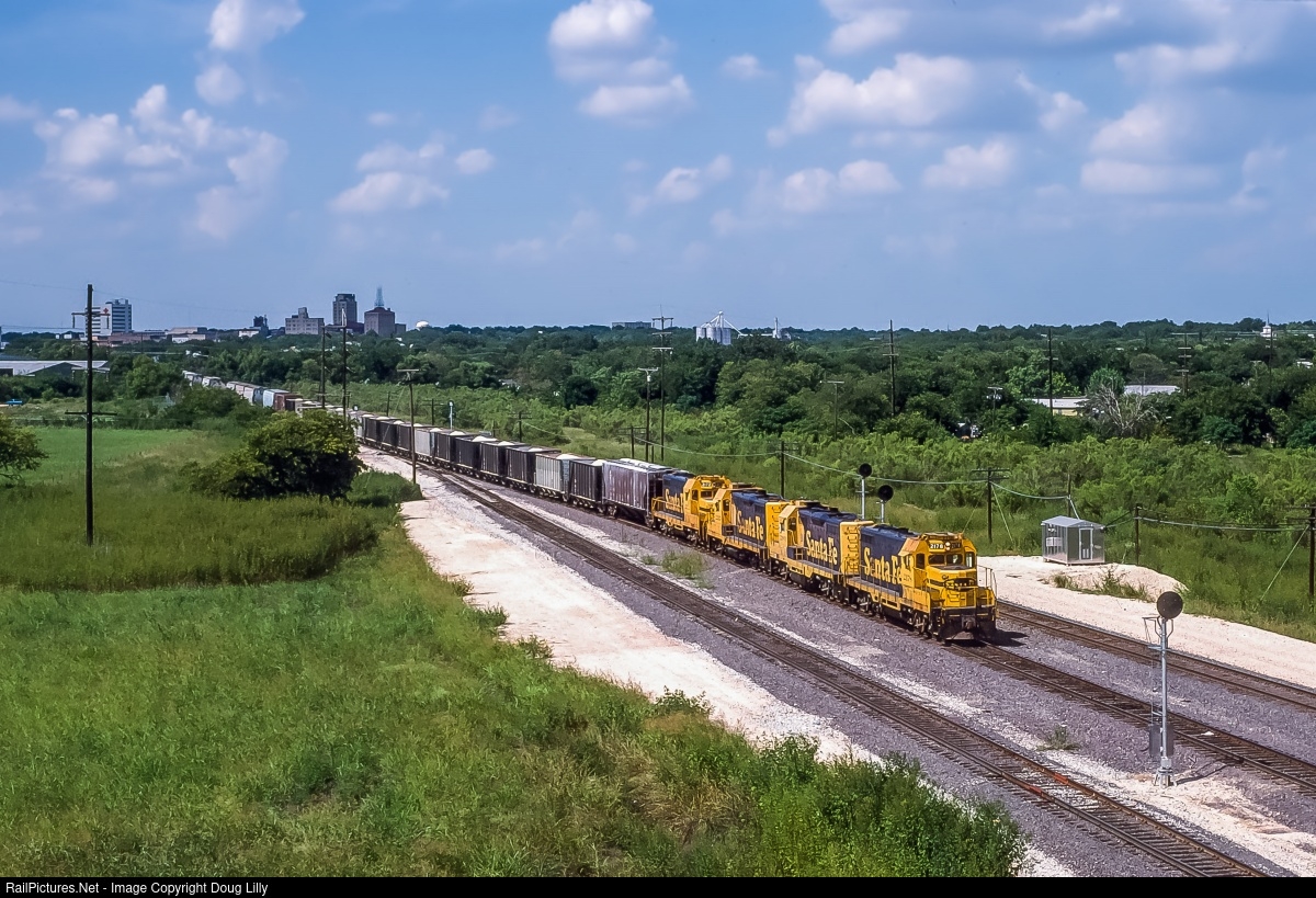 | With the skyline of Temple, Texas looming in the background, four Santa Fe GP20’s roll a manifest into the fuel racks outside of town. |