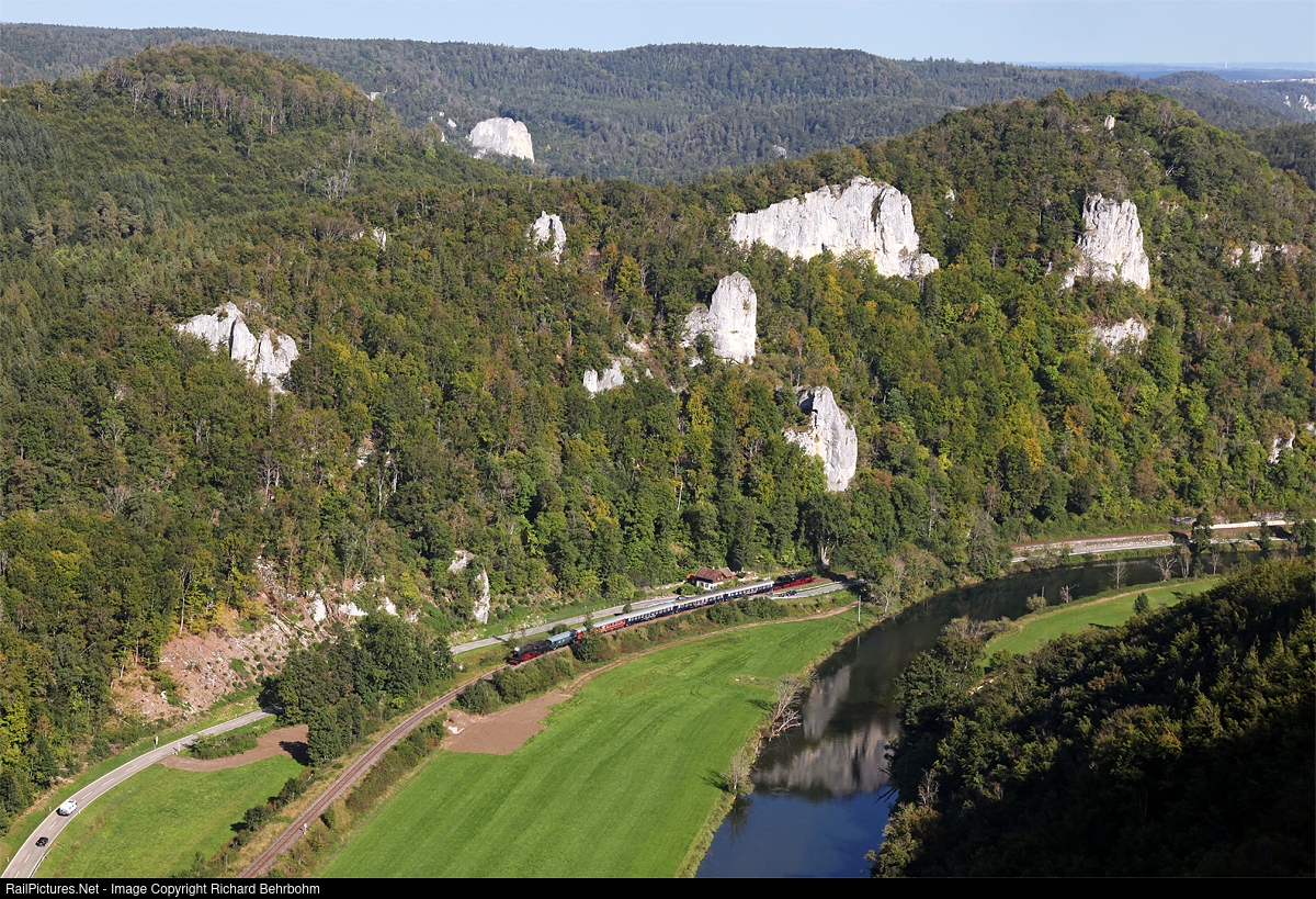 | The 2-6-2 steam locomotive 23 058 of Eurovapor, built in 1955 by Krupp, and at the rear the 2-10-0 steam locomotive 52 7596 of Eisenbahnfreunde Zollernbahnand built in 1944 by Wiener Lokfabrik Florisdorf (Austria) are en route with the "Ablachtal-Donautal-Express" in the Danube valley from Mengen to Tuttlingen. |