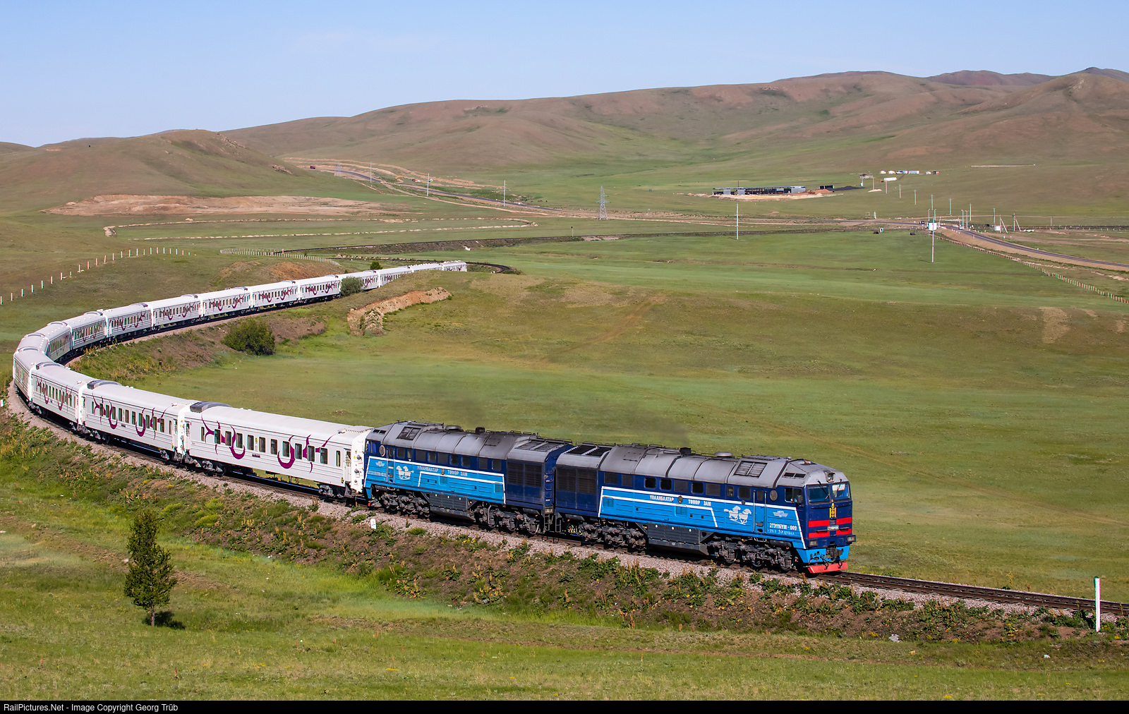 | 2TE116UM # 009 of the Mongolian Railway is pulling train 24 from Ulaanbaatar to Beijing (1548 kilometers in 28 1/2 hours, with two long stops at the border) between Baian and Chaichai. All 16 cars are new built in China and for 140 km/h maximum velocity. Train # 24 circulates on thursday from Ulaanbaatar with this mongolian cars, on friday with chinese cars. |