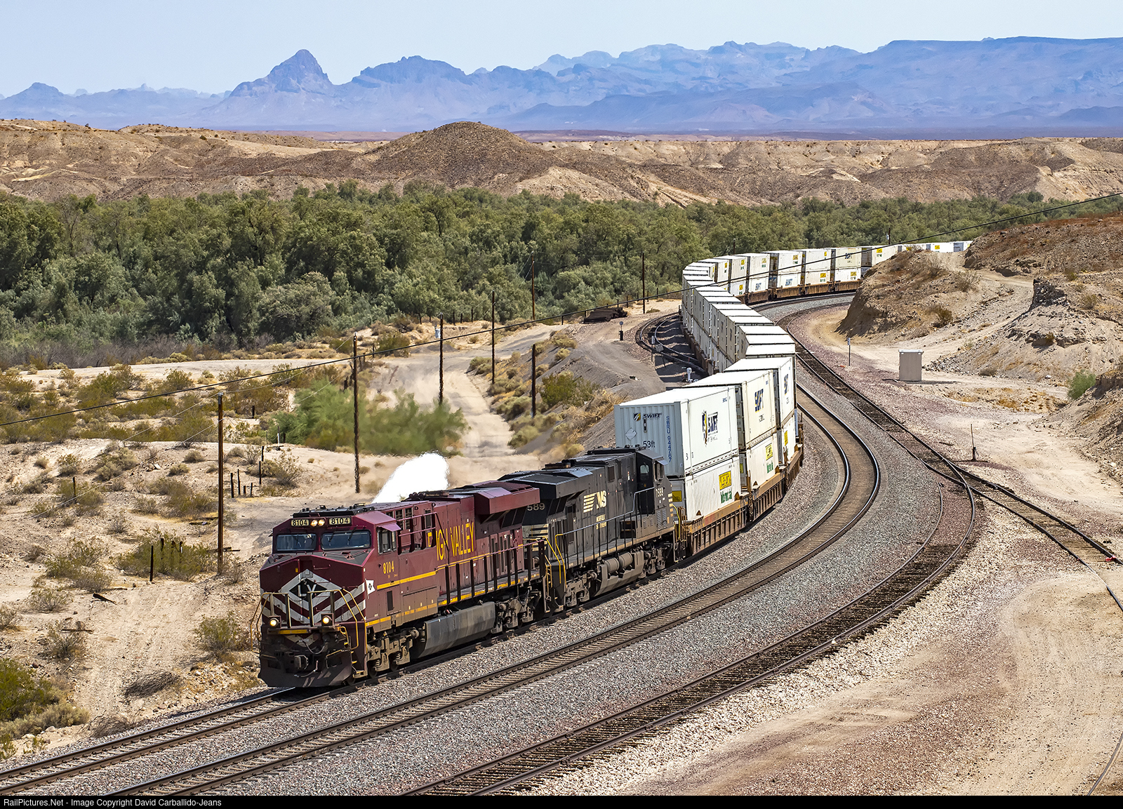 | NS 8104, the Lehigh Valley heritage locomotive, leads the New York to Los Angeles Q-train as it pulls up to a stop at Topock due to the H BELBAR breaking into two just ahead of it. Since PTC software has been updated to be compatible with other railroads, these NS interchange trains have been keeping their NS power on them as they run along BNSF's Transcon. |