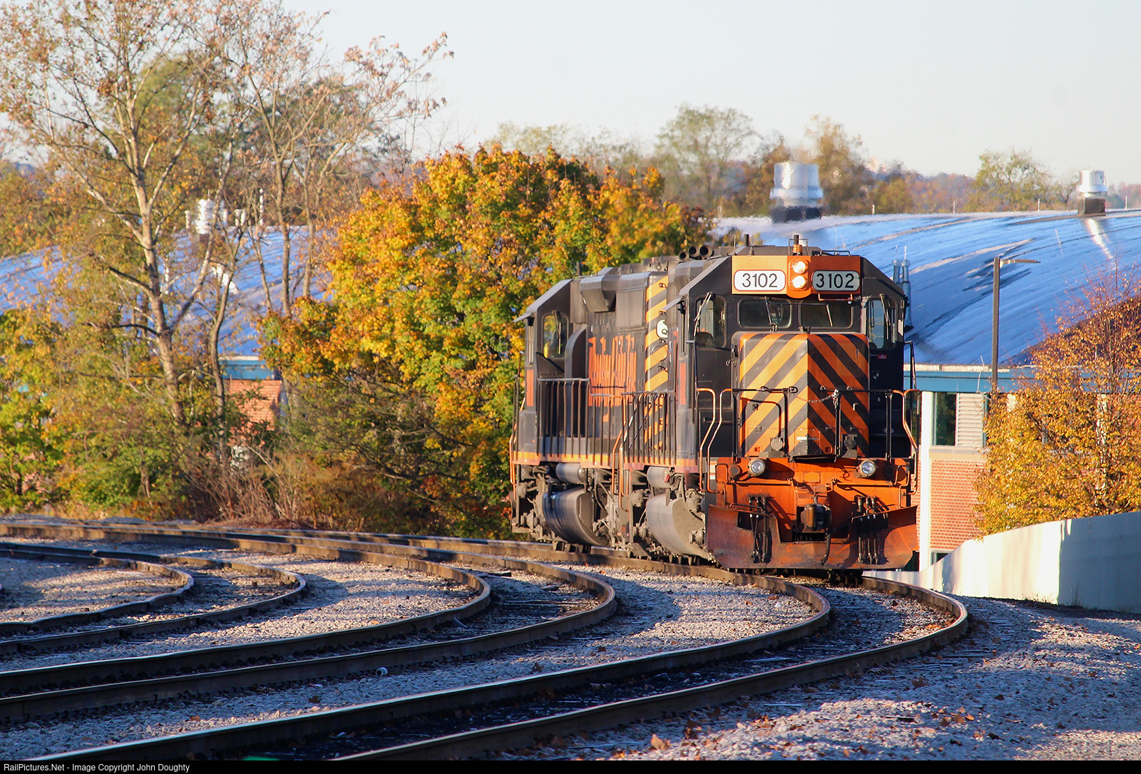| The early morning sun lights up the fall colors on the trees as Wheeling and Lake Erie 3102 and 3016 head south out of Rook yard. Once they reach the end of the yard the conductor will align some of the switches and the engines will back into the yard and on to their train. |