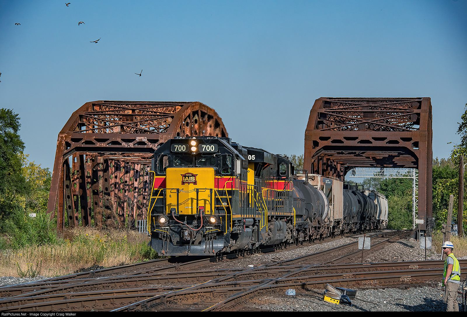 A CSX crew working on the diamonds takes a brief break to allow an Iowa Interstate train, crossing the Calumet Sag Channel on the Baltimore & Ohio Chicago Terminal (also known as the Indiana Harbor Belt/CSX Transportation "Joint Line"), to pass by as it makes its way IHB’s nearby Blue Island Yard. IAIS GP38-2 700 (with a rather lengthy lineage: ex-LLPX 2301, ex-UP 410, ex-UP 1910, ex-EMDX 740, ex-CR 7940, ex-PC 7940; née-EMD 740) and ES44AC 505 (which, having been purchased new, has no heritage at all!) are having no problem pulling this long train on the flat midwestern trackage. (Blue Island, Illinois - September 27, 2021)