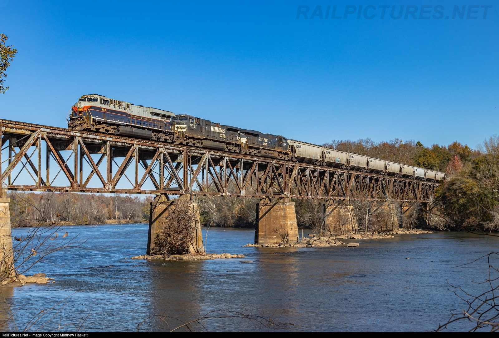 Under a clear chilly late November Carolina sky 50V with 8101 leading crosses the Catawba River bridge in Rock Hill, SC.