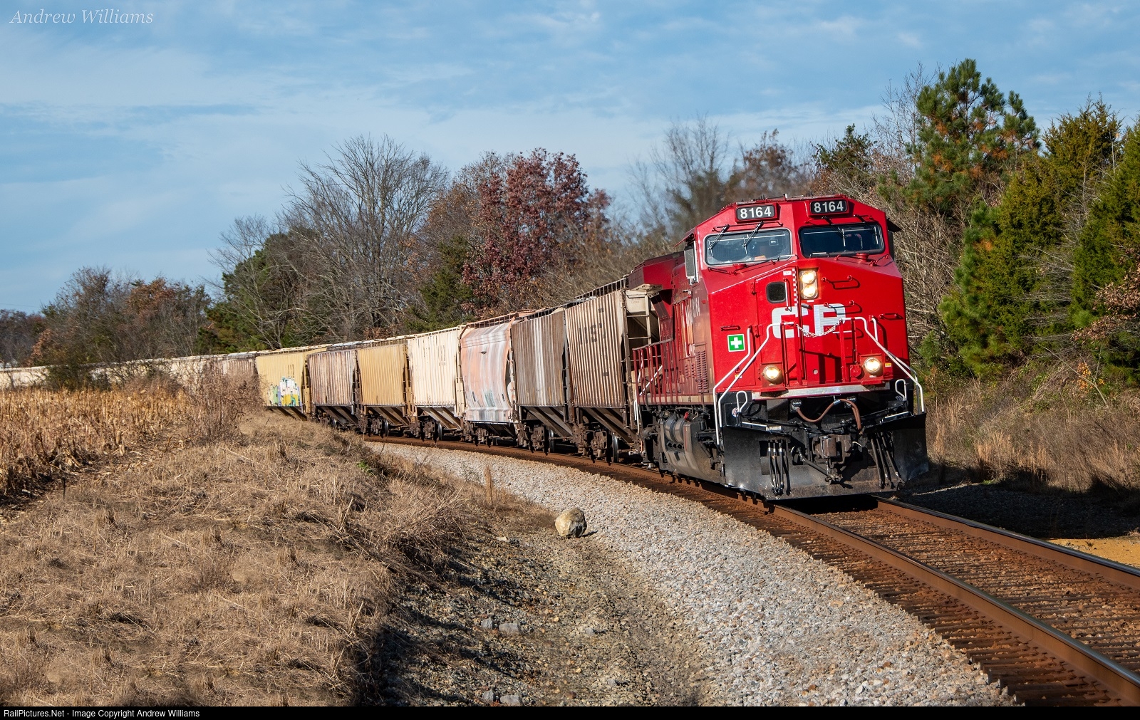 | Rolling down the EX L&N Cincinnati to Atlanta Etowah Subdivision, CSX K821-23 sweeps around the curve in Old Fort this afternoon heading south to Atlanta. Following a Q541 out of Etowah the train would come to a stop at Conniston to wait for the Q541 to work Wyvern Yard in Cartersville before continuing south. With 93 empty phosphate hoppers in tow, the crew had no problem running the light train south at track speed. The CP 8164 one of their AC4400 class series rebuilds was solo out front gleaming in the winter sunlight. |